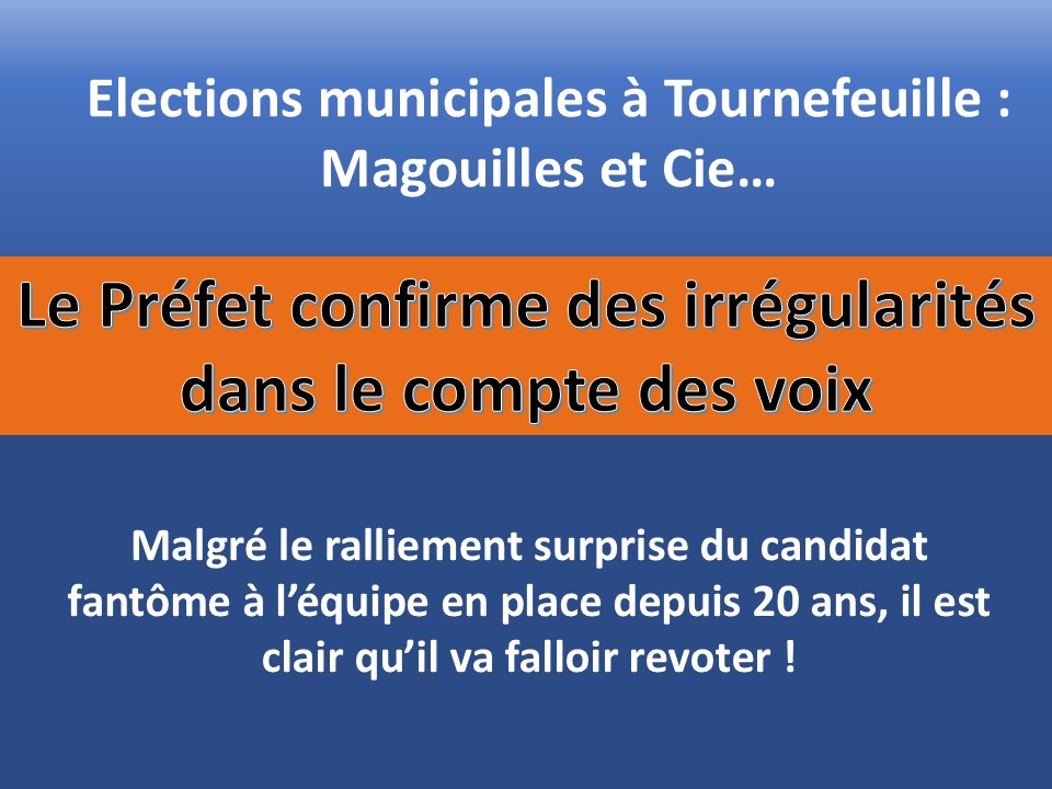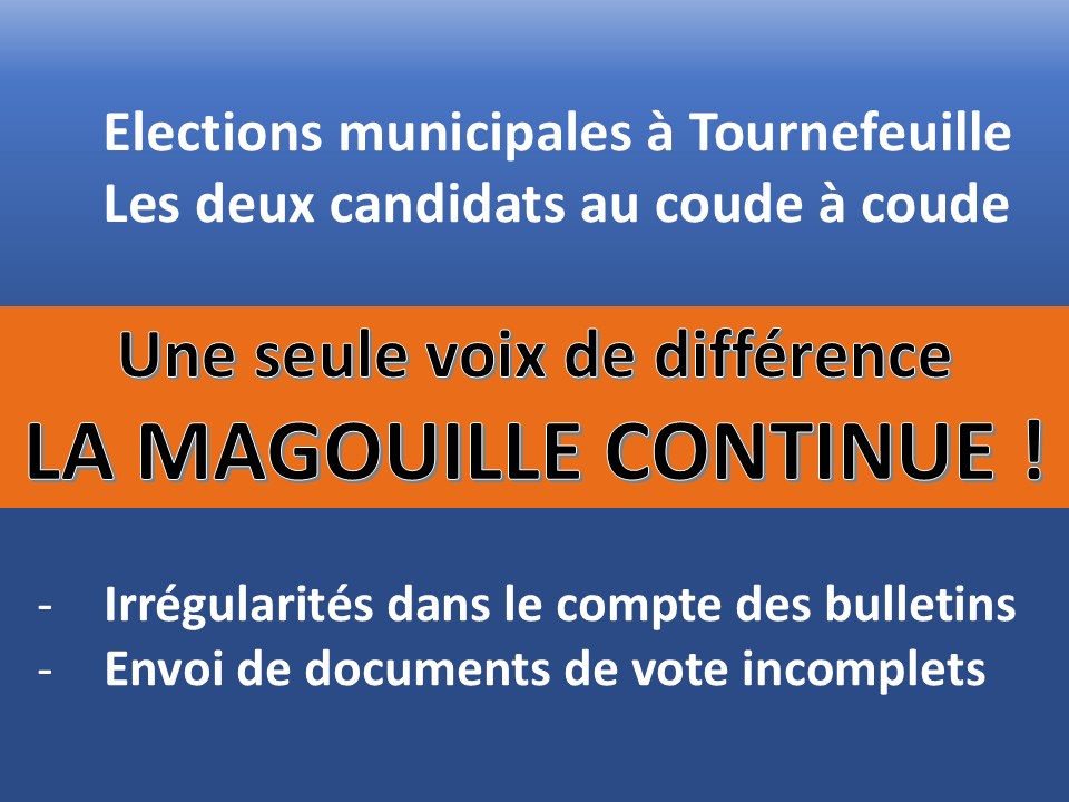 Après le ralliement surprise de Stephane PEREZ (le « dynamique » au programme fantôme) à la liste du Maire sortant Frédéric PARRE, le feuilleton tournefeuillais continue… Une seule voix d’écart entre les deux candidats restants, PARRE et SOULIE. Au passage, on peut constater que les électeurs qui se sont malencontreusement portés sur la liste de Mr PEREZ ont compris qu’il s’étaient fait flouer et ont massivement rejoint son adversaire !